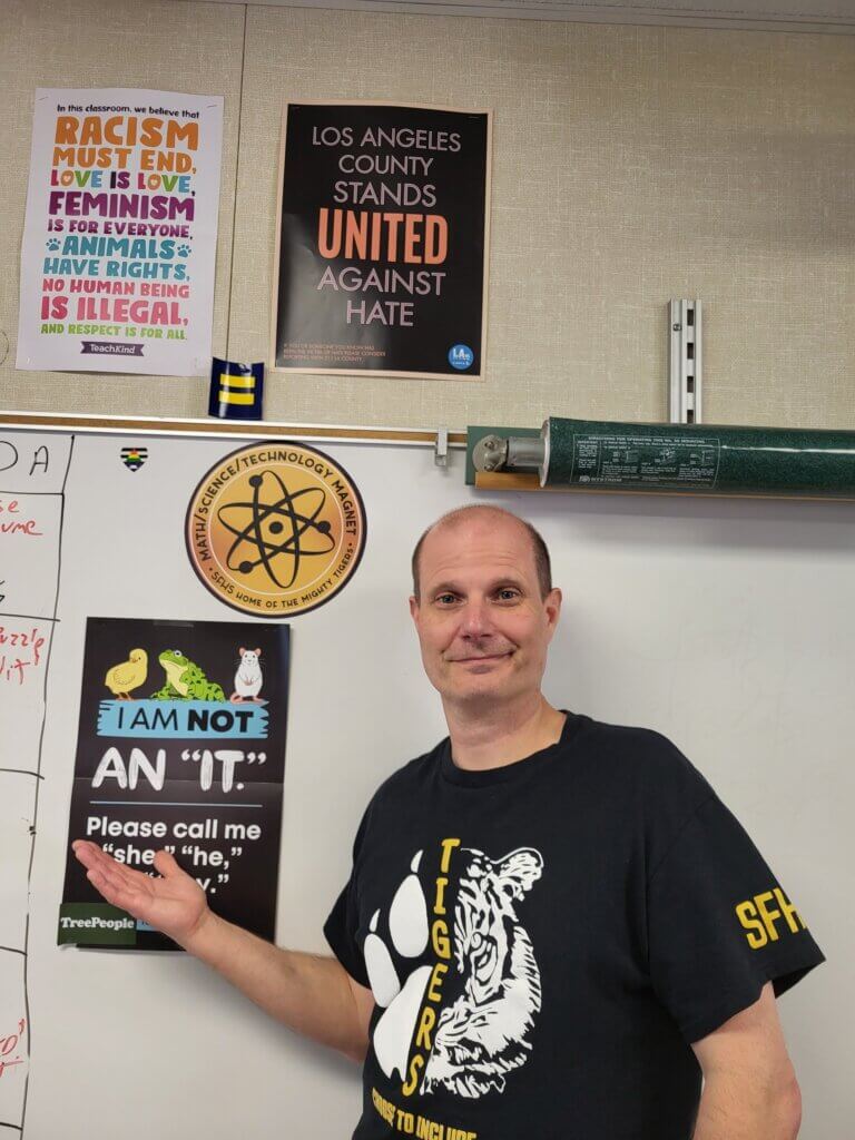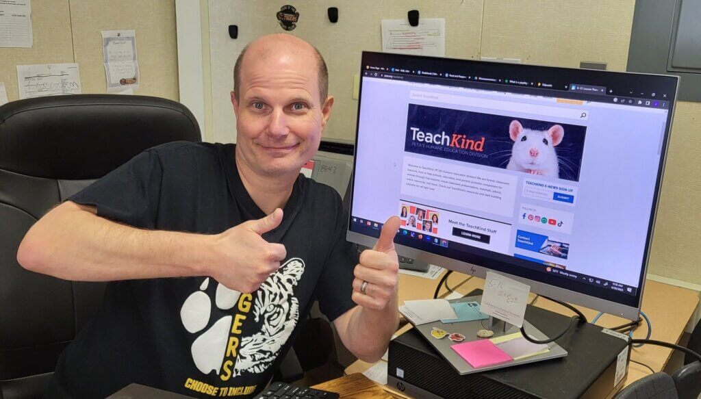 John inspires his students to help animals outside school as well. Some volunteer to clean up local beaches for the benefit of the animals who call it home, the environment, and the rest of the community—and others spend their free time caring for homeless cats and dogs at their local animal shelter. John even displays TeachKind’s empathy-building posters in his classroom, quietly but effectively reminding students to choose animal-friendly language and recognize the connection between animal rights and other social justice issues.