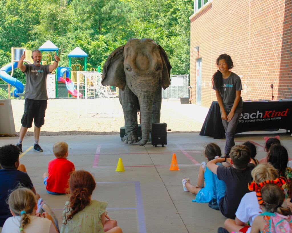 Ellie is a young elephant who was recently rescued from the circus. She moves her head, wiggles her ears, and laughs along with students as she talks about the importance of having empathy for all living beings, no matter how large or small.