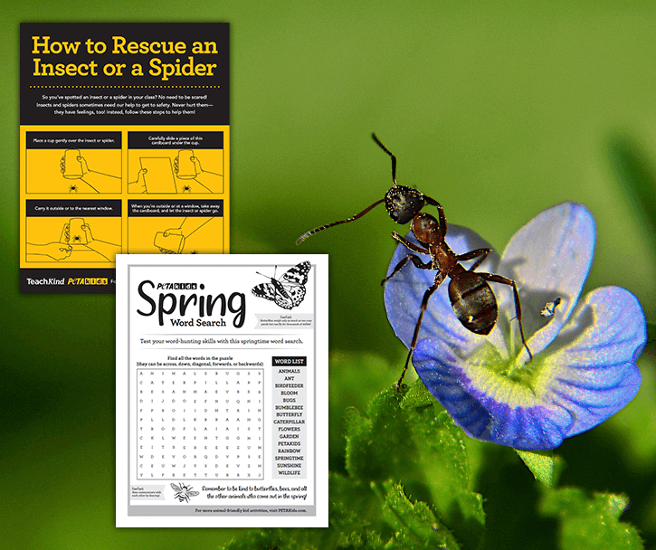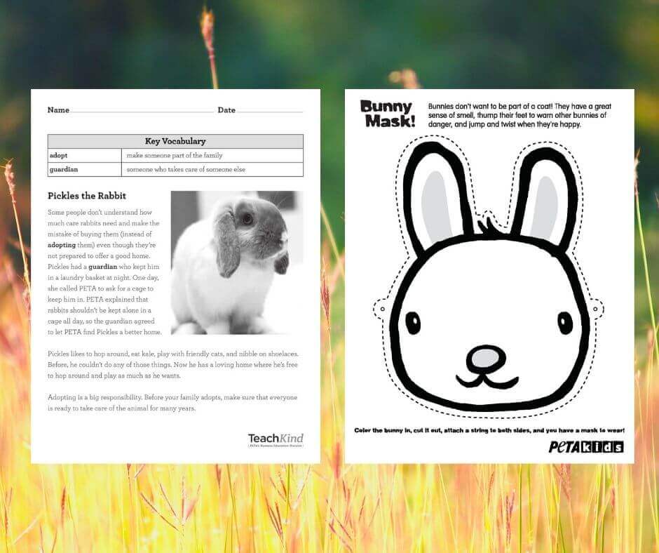 Each Easter, many families purchase rabbits, thinking that they’ll make a great addition to the family—but sadly, the majority of them end up being kept in small outdoor cages called hutches, being sent to animal shelters, or being released outdoors, where they often starve or are killed by predators. Teach students to empathize with rabbits and to resist the temptation to buy one when there are already so many adoptable ones who need loving homes. You could read The 17 Most Important Bunny Facts of All Time or project it for your students to read. Then, have them compare and contrast rabbits and humans. You could also use this reading comprehension worksheet about Pickles, a rabbit who was rescued by PETA, to teach students the importance of adopting—rather than buying—animal companions and of providing them with the care that they need. Afterward, have them make one of these adorable bunny masks. (Hopping around the classroom is optional!)