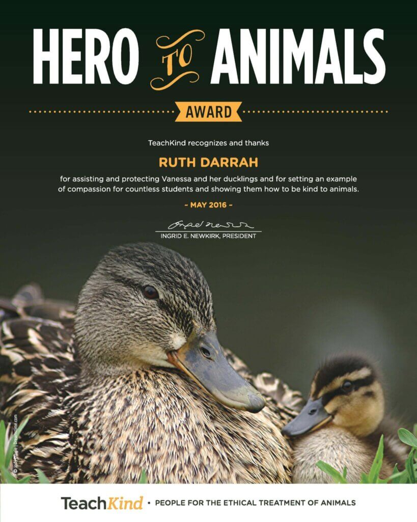 Squee! How wonderful is that? Because of the true thoughtfulness and compassion shown for this duck family, TeachKind is giving Darrah a Hero to Animals Award and Village Elementary School a Compassionate Action Award.