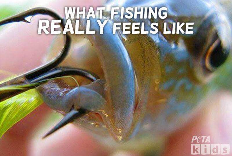Fish may have eyes that never close (it’s true!) and fins instead of arms and legs, but that doesn’t mean that they don’t feel pain. They have very sensitive mouths and nervous systems that closely resemble those of mammals, so they’re hurt badly when they’re caught on hooks or in nets. And just as humans can’t breathe underwater, fish can’t breathe when they’re out of water. So when they’re pulled out of their watery homes, they start to suffocate and panic. Even if fish are thrown back into the water, they can die from injuries caused by hooks.