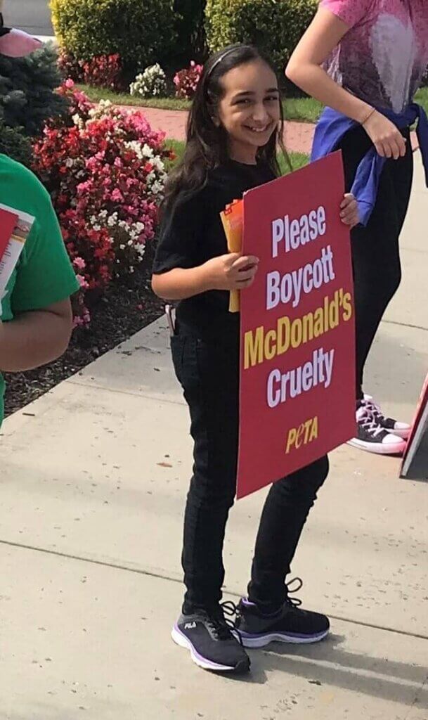 Erin organized her first protest outside a McDonald’s restaurant at just 11 years old. Three years later, she has organized and attended numerous other protests, scored a veggie burger addition to her school cafeteria’s menu, and even spoken about animal rights at both the Coalition for Healthy School Food Fall Gala and the vegan festival in her town. She isn’t afraid to inform her peers about speciesism, passing out literature at school and in her community to help end it. She has also organized protests against Starbucks, urging the company to stop charging customers extra for choosing dairy-free milks, and Forever 21, demanding that it stop supporting the bloody, violent wool industry by selling wool items.