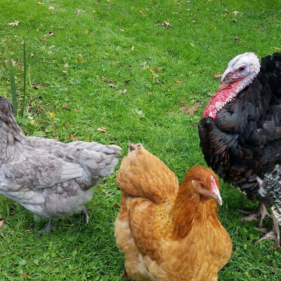Just like all turkeys, Mayflower has a unique personality. After being rescued, he befriended Lucy and Ethel, two chickens he now roosts with.