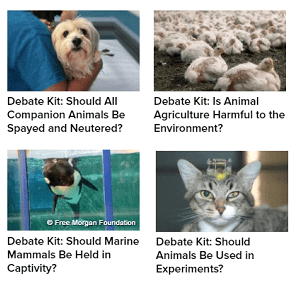 TeachKind’s debate kit series covers a wide variety of animal rights issues, from the effects of animal agriculture on the environment to the use of marine mammals for entertainment. These lessons build students’ research, argumentative writing, and presenting skills while simultaneously promoting empathy not just for animals but also for humans. Resources included in each kit walk students through the process of forming an opinion, backing it up with well-documented evidence, anticipating a counterargument, and preparing a rebuttal—all steps necessary for healthy conflict resolution and the exchange of ideas.