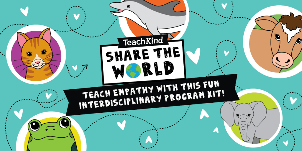 Share the World is an all-inclusive program kit, perfect for teaching elementary school students the Golden Rule and the importance of compassion and empathy. Each pack includes a 23-minute video featuring age-appropriate information about animals, coloring sheets, an anti-bullying poster, and teacher’s guides—plus in-depth lesson plans targeted to students in grades K-2 and 3-5. The best part is that like all TeachKind materials, Share the World is completely free. Order yours today!