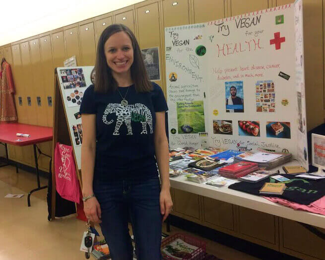 Each year, Sarah and many of her excited students participate in their school’s multicultural fair by hosting a vegan/anti-speciesism–themed table—and this year, she’ll have guests helping with vegan outreach in Spanish, too. In the winter, she hosted a drive among her students to collect all-vegan food, clothing, and toiletries to donate to homeless people and their companion animals.