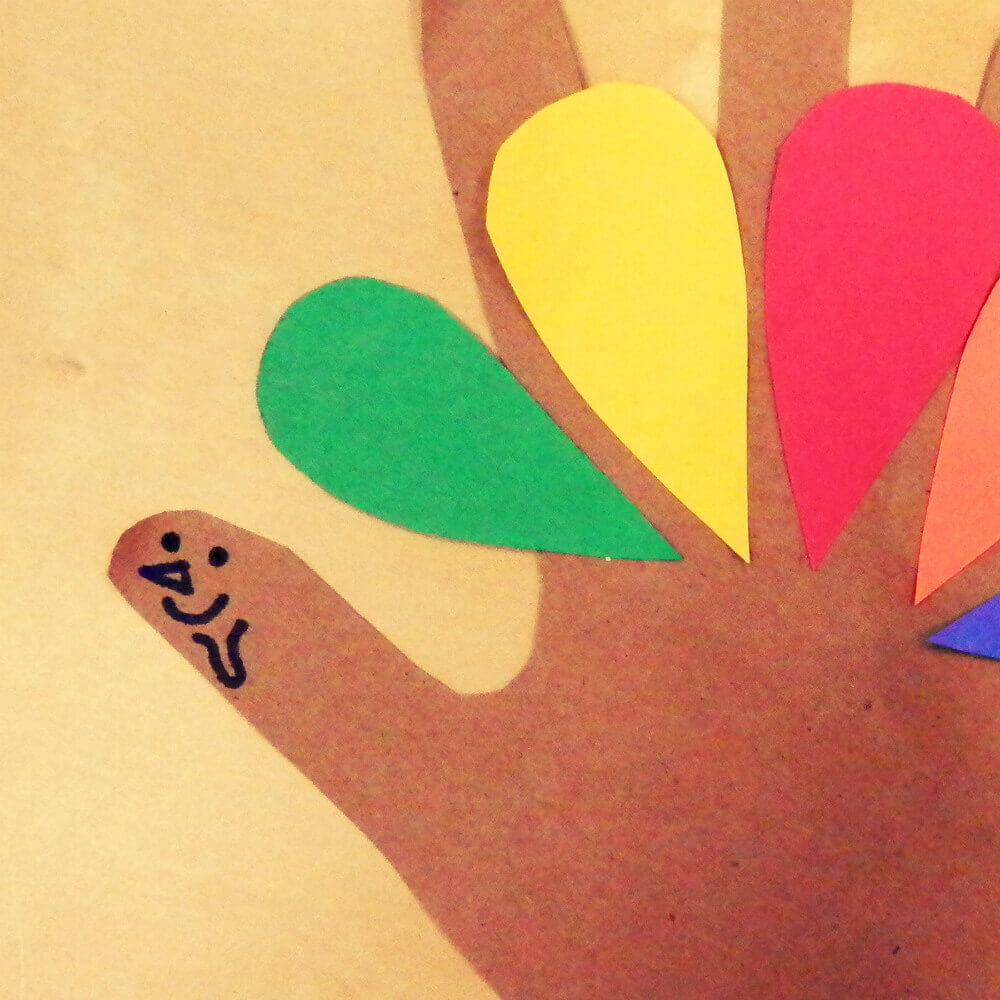 2. If your students are old enough, have them cut the pieces of multicolored construction paper into teardrop shapes. (Otherwise, cut some out beforehand.) Then, have them attach the teardrop shapes to the hand in between the fingers to make feathers.