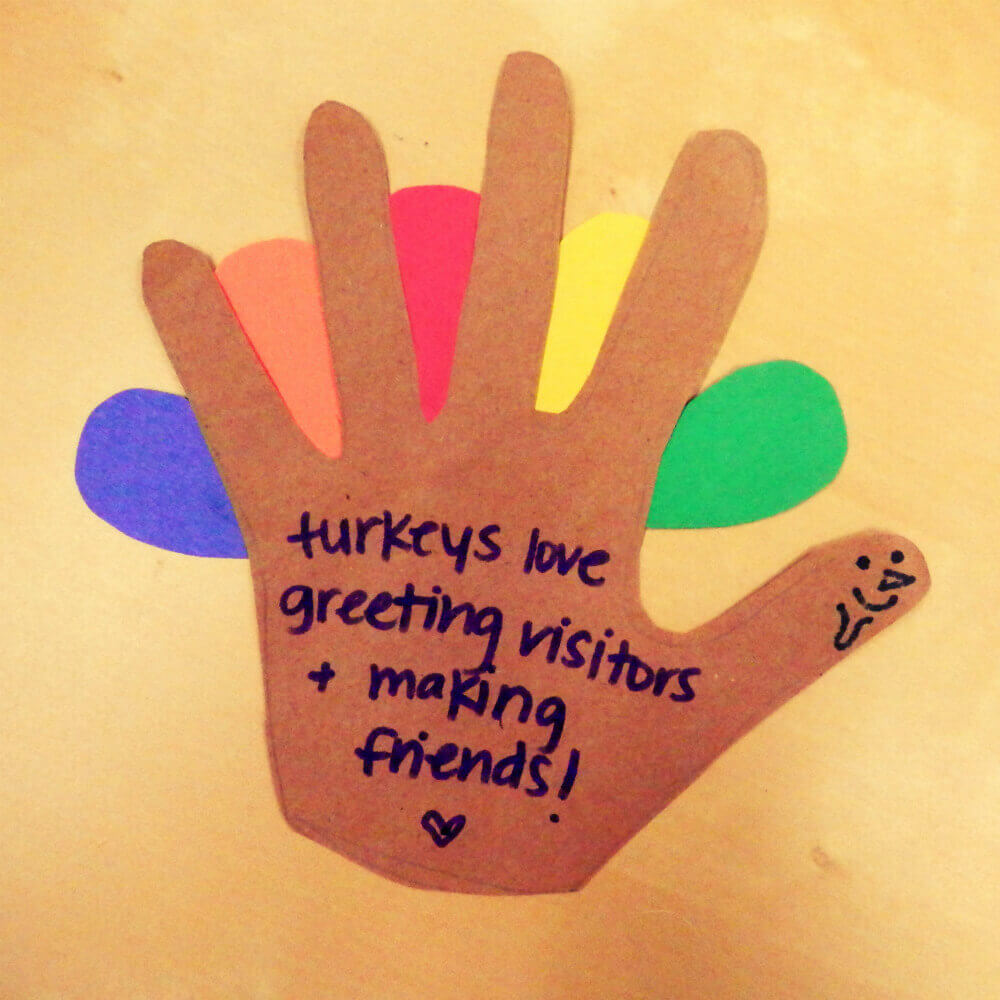 When we think of Thanksgiving, we almost immediately think of turkeys, right? Unfortunately, most think about eating them rather than appreciating the vivacious and interesting animals they are. More than 45 million turkeys are slaughtered each year for Thanksgiving. Turkeys are intelligent and sensitive—they enjoy listening to music, can recognize human faces, and are protective mothers—and we should give them a reason to be thankful. This year, teach your younger students to appreciate turkeys for who they are, and NOT what they taste like, by making a cute hand turkey!
